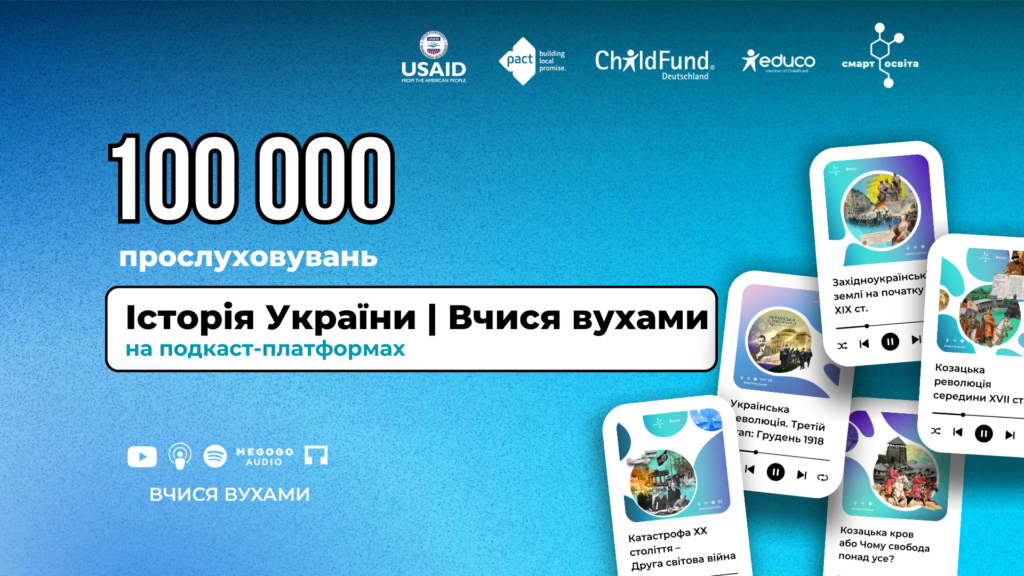 100 000 разів користувачі подкаст-платформ (Spotify, Apple Podcasts, NV Podcast, MEGOGO) прослухали наші аудіоуроки з історії України від проєкту «Вчися вухами». Наразі для всіх охочих доступні 110 аудіоуроків для 7-11 класів.