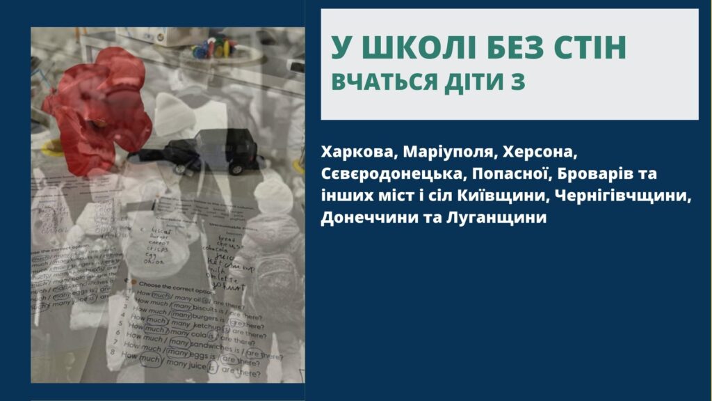 Проєкт “Школа без стін” допомагає дітям, чиї школи не відновили роботу в онлайн-форматі і які не можуть самостійно навчатися на онлайн-платформах (через їхній юний вік, великі прогалини в навчанні, брак навичок самостійно планувати навчання тощо).