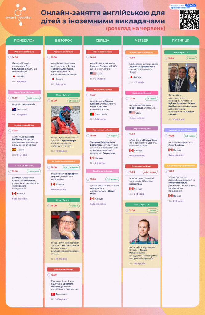 Заняття англійською з іноземними викладачами відбуваються щодня, крім вихідних. Це десятки уроків на різноманітні теми — від науки до куховаріння. Долучитися до них можуть діти будь-якого віку.