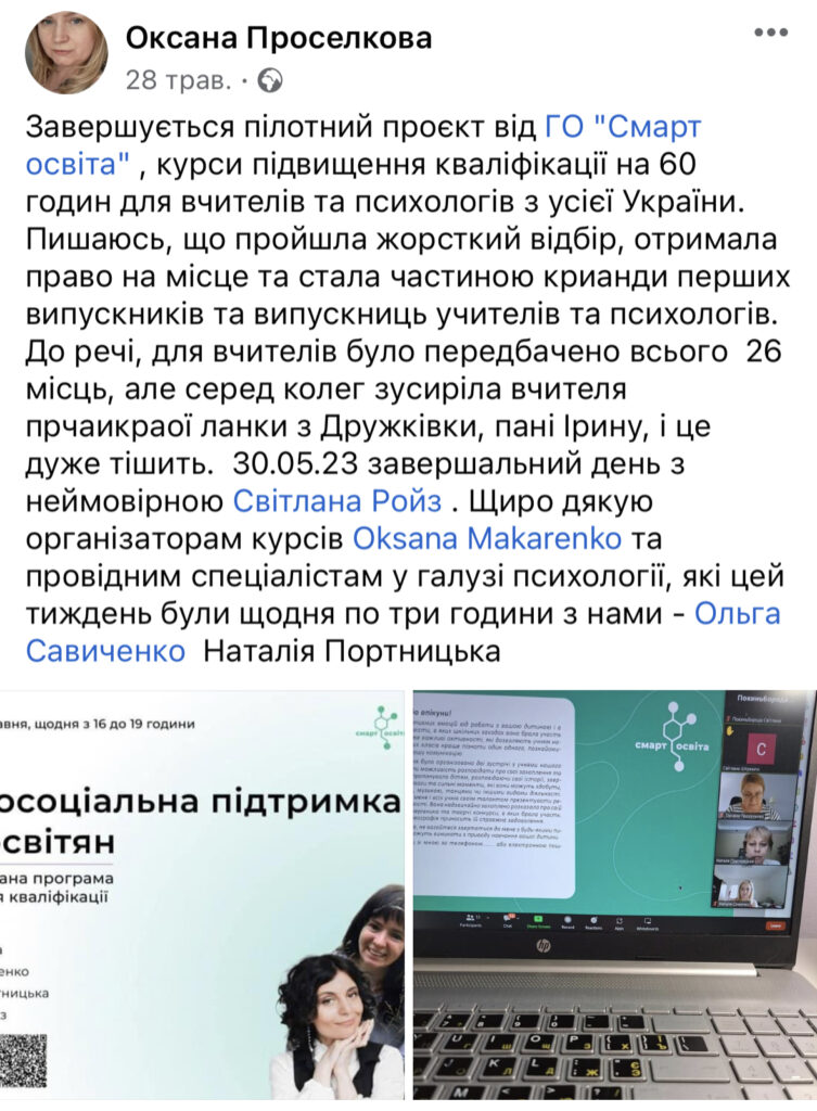 У межах проєкту був модуль із Ольгою Савиченко про психічне здоров’я дітей та підлітків під час війни. Як можуть реагувати діти, які переживають травмуючі події? Я їм допомогти? Сприяти стійкості? Конкретні техніки підтримки, техніки вирішення проблем, основи першої психологічної допомоги, стратегії підтримки.