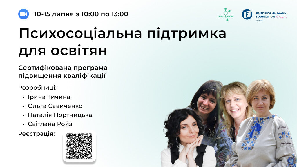 ГО “Смарт Освіта” запрошує вчителів на онлайн-навчання за програмою підвищення кваліфікації “Психосоціальна підтримка для освітян”. Що відбудеться з 10 до 15 липня. Реєстрація за лінком: https://docs.google.com/forms/d/e/.