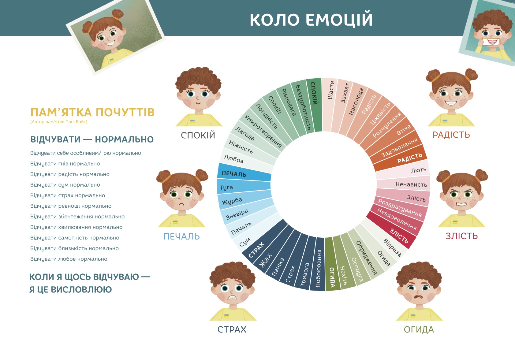 Серед помічних елементів гри — плакат з «колом емоцій», який можна роздрукувати та повісити на стіну кімнати чи групи садочку, або ж класу. Для того, щоб діти звикали до самопізнання та висловлювали свої різні емоції та стани. А за намальованими на плакаті обличчями вчилися розрізняти їх у оточуючих. На плакаті продемонстрували різні емоції, але сектор із радістю є найбільшим, аби ставав ресурсним для дитини.