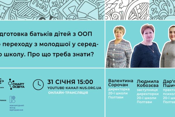 Запрошуємо на онлайн-трансляцію “Підготовка батьків дітей з ООП до переходу з молодшої у середню школу. Про що треба знати?”26.01.2022