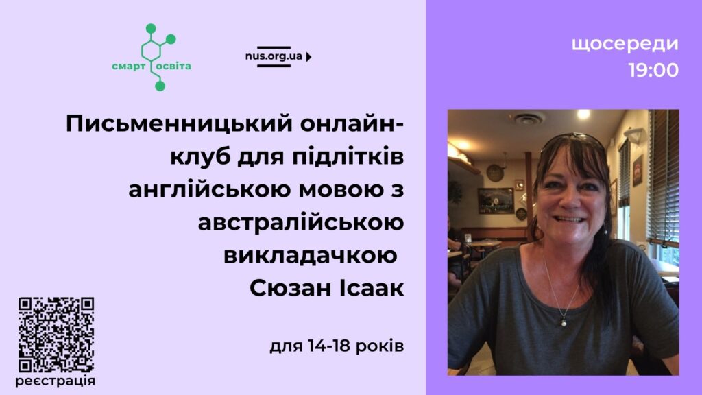 Австралійська викладачка С’юзан Ісаак проводитиме онлайн-заняття англійською для дітей 14-18 років. Де в дружній атмосфері ви зможете обговорювати сюжети книжок та разом створювати нові історії, і, звісно ж, практикувати розмовну англійську.