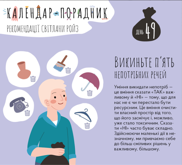 У вас точно є речі, якими ви давно не користувалися, купили заради самої купівлі, або просто старий непотріб, якому вже давно не місце на полицях. Ці речі захаращують місце для чогось справді важливого. Тож варто вміти сказати “так” новому і категоричне “ні” – старому. Коли ви навчитеся без страху, провини чи інших негативних емоцій робити такі маленькі кроки, ви зможете легше прощатися із чимось негативним у вашому житті.