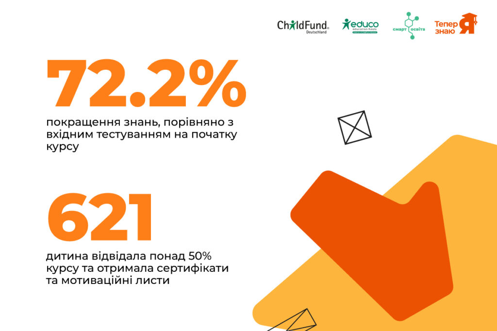 За результатами фінальних тестувань із математики та української мови діти показали до 72.2% покращення знань, порівняно із вхідним тестуванням на початку курсу.