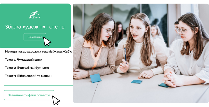 Щоб знайти посилання на збірку текстів з робочими аркушами для учнів й учениць, натисніть на кнопку «Збірка текстів для учнів» на головній сторінці сайту та перейдіть у кінець усіх текстів, до кнопки — «Завантажити файл повністю».